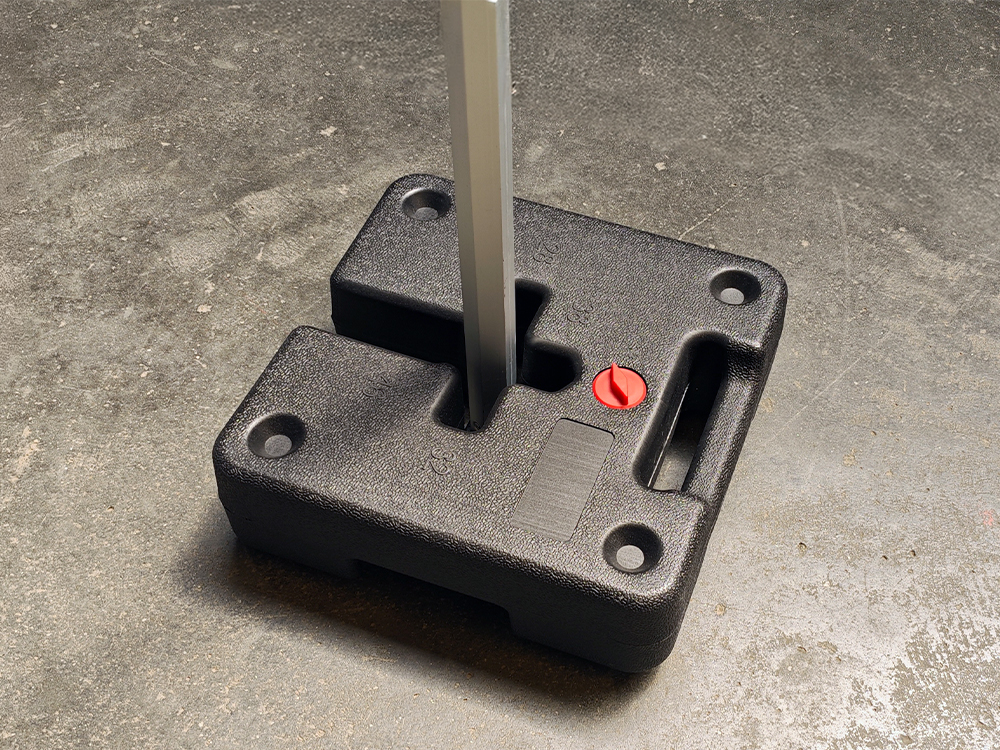 Nous recommandons d'utiliser au moins un poids de pied rembourré par montant. Pour une tente pliante de 2x2, 2x3, 3x3 ou 3x4,5, prévoyez donc 4 poids par tente, et pour une tente de 3x6 ou 4x8 mètres, prévoyez de préférence 6 poids.