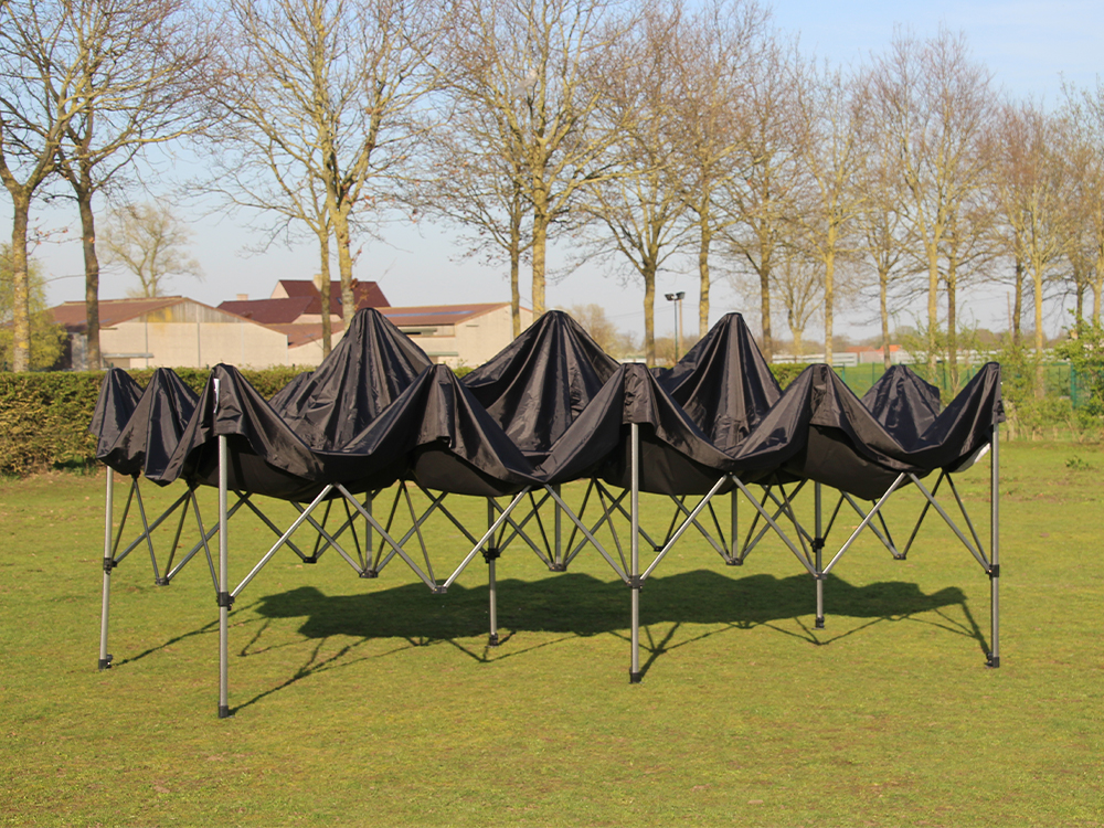 Le châssis aux tubes de section carée en acier durci (32x32 mm) et les pièces de jonction en nylon forment une base robuste. Vous montez (et démontez !) ce barnum dans quelques instants grâce à la structure tubulaire pliante. Parfait si vous ne voulez pas perdre du temps en installant votre tonnelle. Adaptez la hauteur du barnum avec les boutons-poussoirs.